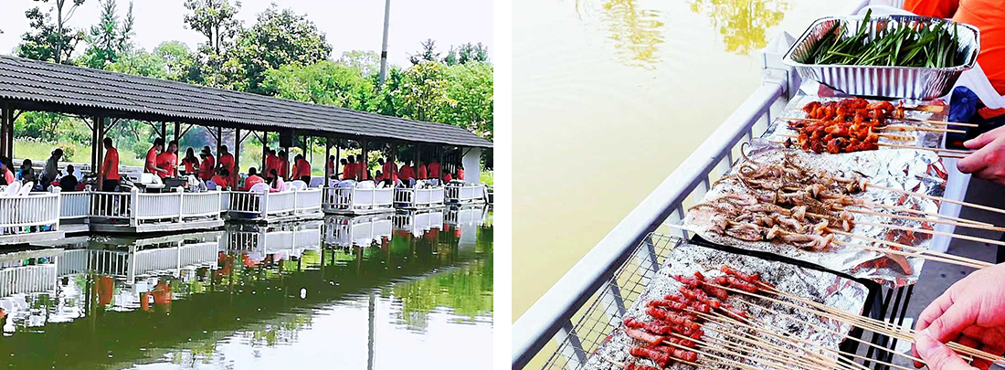 動(dòng)力圈結(jié)束后就到了中午的燒烤時(shí)間,我們從草坪出發(fā)沿著營(yíng)地湖邊走到了湖上的水上長(zhǎng)廊,坐在涼風(fēng)習(xí)習(xí)的水中亭廊上,各式各樣的燒烤食材齊齊擺上,公司里一個(gè)個(gè)隱藏的燒烤老師傅開(kāi)始大顯身手,金黃的雞翅,油滋滋的五花肉,香噴噴的魷魚(yú)等一一出爐。同事們悠閑的坐在椅子上,吹著微風(fēng),吃著美味的食物,喝著爽口的飲料和酒,還有同事自制了工具用著烤好的食物去勾著湖里的小蝦。
